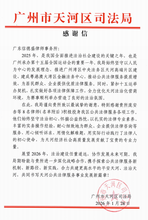 近日,广州市天河区司法局向广东信德盛律师事务所发来一封热情洋溢的《感谢信》,对我所及蔡叶艺、陈婷娜、陈阳阳、胡磊、罗伟仪、庞安杏、余琦、周倩共八名律师在2025年度积极参与天河区公共法律服务工作所做出的突出贡献,致以最诚挚的谢意和高度肯定。